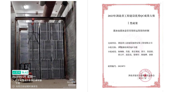 依托公司”青創(chuàng)”工作室的平臺,項目部組織成立QC小組,將蓄冰盤管吊裝轉(zhuǎn)運過程作為研方向,研究成果——蓄冰池蓄冰盤管吊裝轉(zhuǎn)運裝置的研制榮獲“2023年湖北省工程建設(shè)優(yōu)秀QC成果大賽Ⅰ類成果”,這是對項目部的努力付出最好的認可。